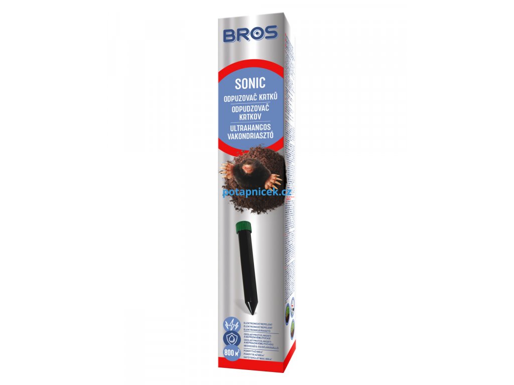 Bros Sonic odpuzovač krtků vysílá zvukové vlny a vibrace, které jsou pro krtky, hraboše a jiné hlodavce nepříjemné a prostor, kde se vibrace vyskytují, opouští. Lidem ani domácím zvířatům tyto vibrace nijak neškodí.Tento odpuzovač je šetrných vůči životnímu prostředí a nevyžaduje použití chemikálií. Pevné pouzdro zajišťuje bezproblémový chod po mnoho měsíců bez ohledu na roční období a povětrnostní podmínky.