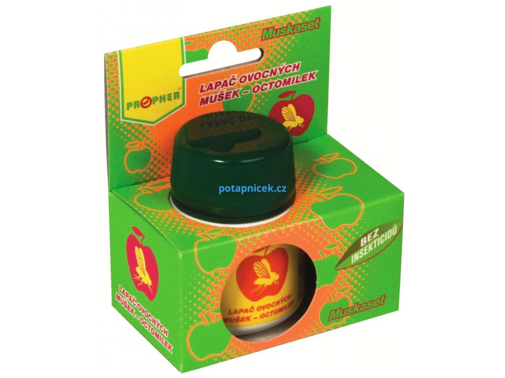 Muskaset - octomilky je lapač speciálně vyroben pro přilákání a odchyt octomilek, známých také jako vinné mušky. Mušky láká na návnadový roztok, který je uvnitř pasti. Roztok je čistě na přírodní bázi bez insekticidů.
