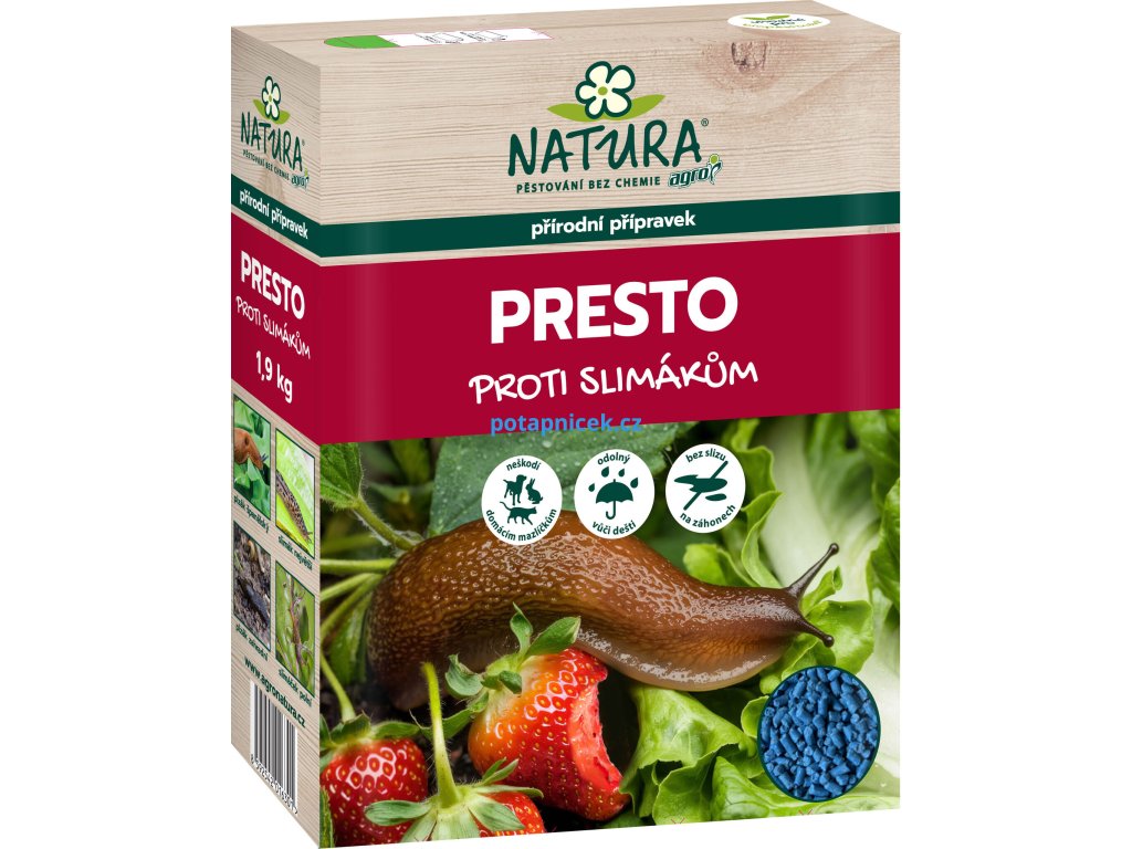 Účinný a šetrný přípravek proti slimákům (plzák španělský, slimák největší, plzák zahradní, slimáček polni), který chrání zeleninu, bylinky i okrasné rostliny. Natura Presto obsahuje fosforečnan železitý – látku běžně se vyskytující v přírodě, díky které slimáci po pozření granulek přestanou žrát, stáhnou se do půdy a uhynou.