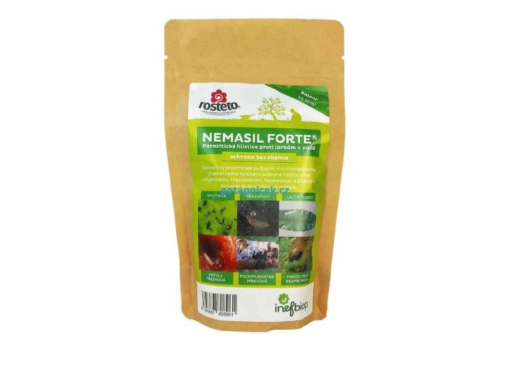 Nemasil Forte® je biologický přípravek s živými hlísticemi / háďátky, které napadají a likvidují larvy hmyzu v půdě. Obsahuje český druh Steinernema feltiae, běžně se vyskytující v přírodě. Po aplikaci hlístice aktivně vyhledávají škůdce a během několika dní je zahubí. Vermikulit, ve kterém jsou hlístice obsaženy, zároveň pomáhá zlepšit provzdušnění a kvalitu půdy. Nemasil Forte zaručuje rychlý účinek – likvidace larev během několika dnů.